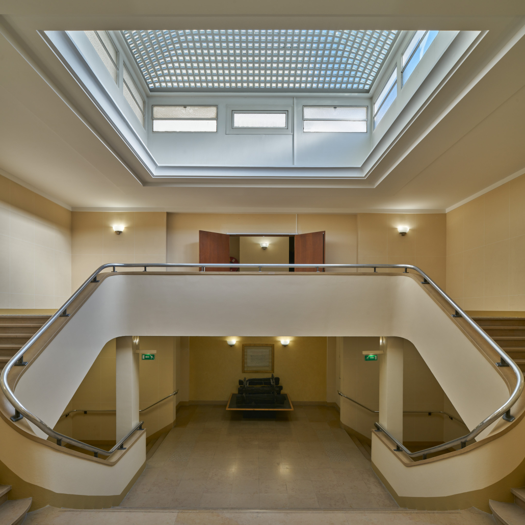 The main entrance hall sets the tone. Stone columns, double staircase, skylight: the architecture reigns supreme.