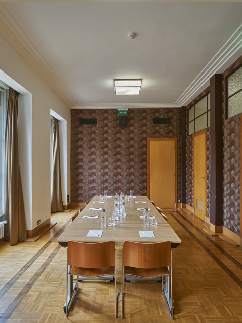 On the first floor, Room 151 reveals another facet of Perzel’s presence in the building. Here, it is the No. 601 pendant lights that structure the space in depth. Their clean lines interact with the strict geometry of the ceiling. The No. 341 V wall lights on the sides complete the arrangement by providing more enveloping side lighting.